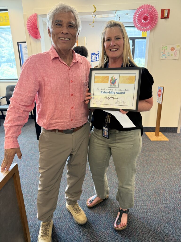 The Extra Mile Award acknowledges and honors current teachers for “having gone the furthest in the service of the South Whidbey education community,” according to a press release. Breeze received the award from School Board Director Linda Racicot at a faculty luncheon June 17.
